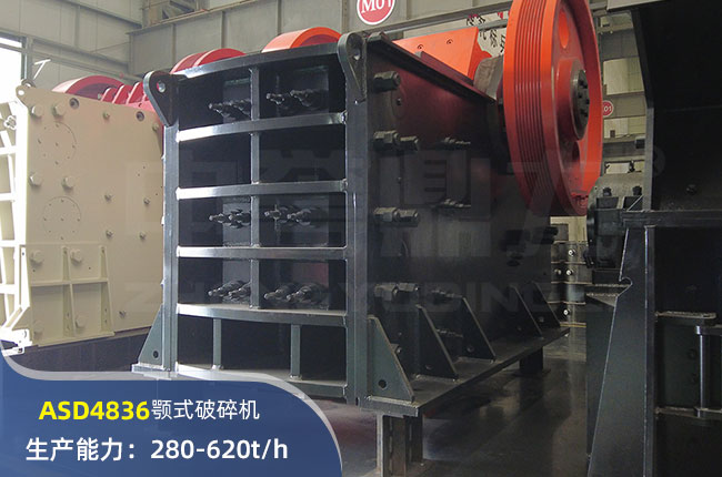 ASD4836顎式破碎機進料口尺寸1220×910mm,進料粒度≤850mm,出料大小≤75mm,電機功率160kw,時產在280-620噸左右。