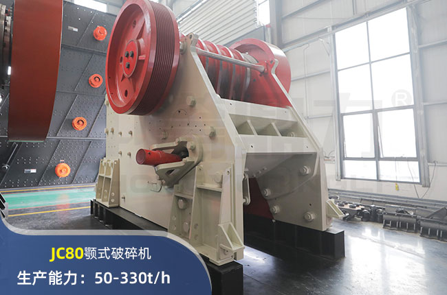 JC80顎式破碎機進料口尺寸800×510mm,進料粒度≤430mm,出料大小≤40mm,電機功率75kw,時產量在330噸左右。
