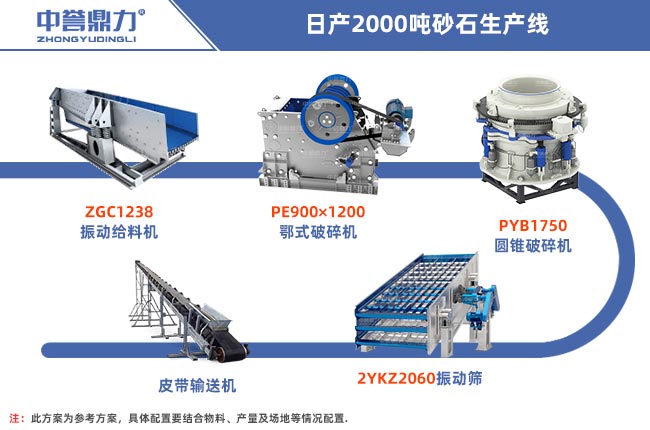 固定式生產線通常由給料、破碎、篩分、輸送等設備組成,日產2000噸也就是時產250噸左右,可以搭配ZGC1238給料機、PE900×1200顎式破碎機、PYB1750圓錐破碎機、2YKZ2060振動篩、輸送機。