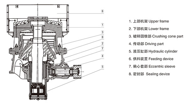 圓錐式礦山碎石機:在操作過程當中,電機通過驅動系統驅動偏心套操作,動錐在偏心軸套的迫動下做操作擺動,動錐挨近靜錐的區段即成為機腔,石頭獲得動錐和靜錐的多次擠壓和抨擊而破碎,動錐離開該區段時,該處已破碎到要求粒度的石頭在本身重力影響下下落,從錐底排出。